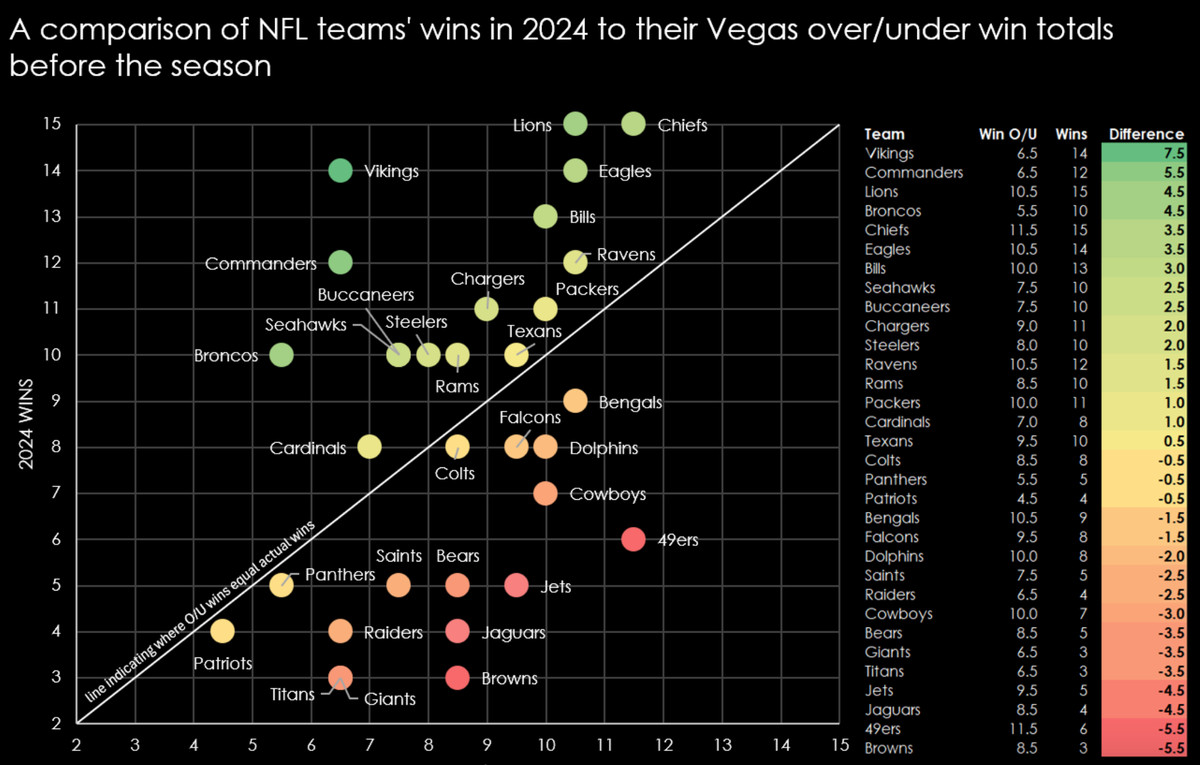 Here are the preseason odds from 2024 (over/under win totals) along with the actual 2024 records of each NFL team, from Pro Football Reference, plotted by analyst Jason Pauley: