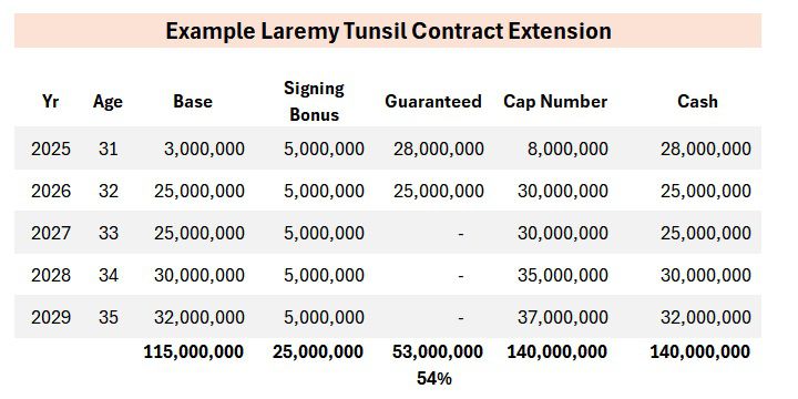 In this structure, I have converted about $18m of Tunsil’s 2025 salary into signing bonus and increased guaranteed money to $53m. This would increase his 2-year cash flow by about $11m, bring a huge chunk of the cash forward in time as an upfront bonus payment, and enhance his guaranteed money by $43m. The team would benefit in the latter years because the relatively mild salary cap escalation in the final 3 years of this structure should make his contract affordable under an increasing league-wide salary cap, and should also make the contract easy to restructure or extend in ‘28 or ‘29.