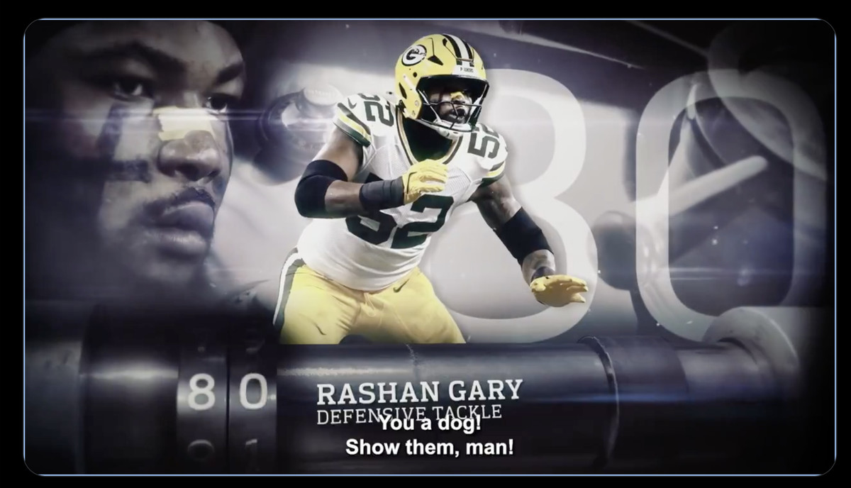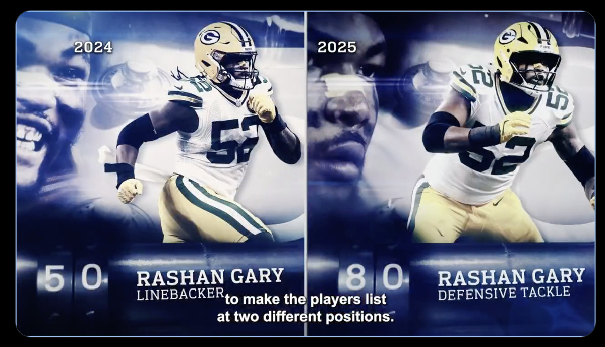Then the narrator doubled down on the position switch, highlighting Gary as one of the few players to make the list at multiple positions in the history of the Top 100 list, and they said outright that he played defensive tackle last year, despite showing highlights of him playing on the edge.