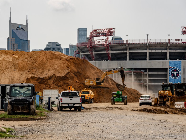 An excavator works on a large dirt mound a the Nissan Stadium construction site. Credit: Martin R. Cherry / Nashville Banner