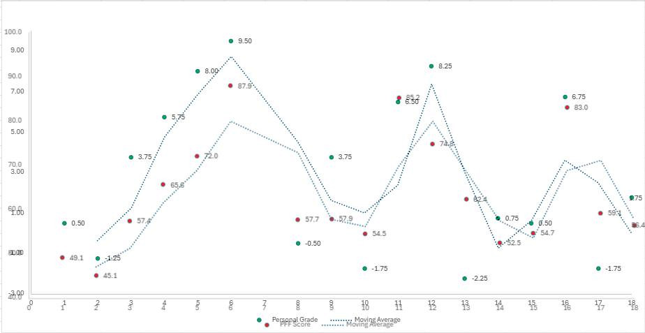 Am I an expert? No, definitely not. At the end of the day, I am just a fan of the sport who wants to share his passion with others. Still, some of the data I collected independently from the 2024 season happens to align quite well with PFF’s metrics from that same year.