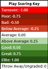 Every play where the quarterback is the focal point, whether as a passer or primary runner, is reviewed and assigned a grade. This includes plays that are negated by penalties and two-point conversion attempts. The grading scale ranges from +1.00 to -1.75. Negative plays are treated fairly harshly and can be compounded. For example, a poor throw that results in a turnover would receive the lowest grade of -1.75.