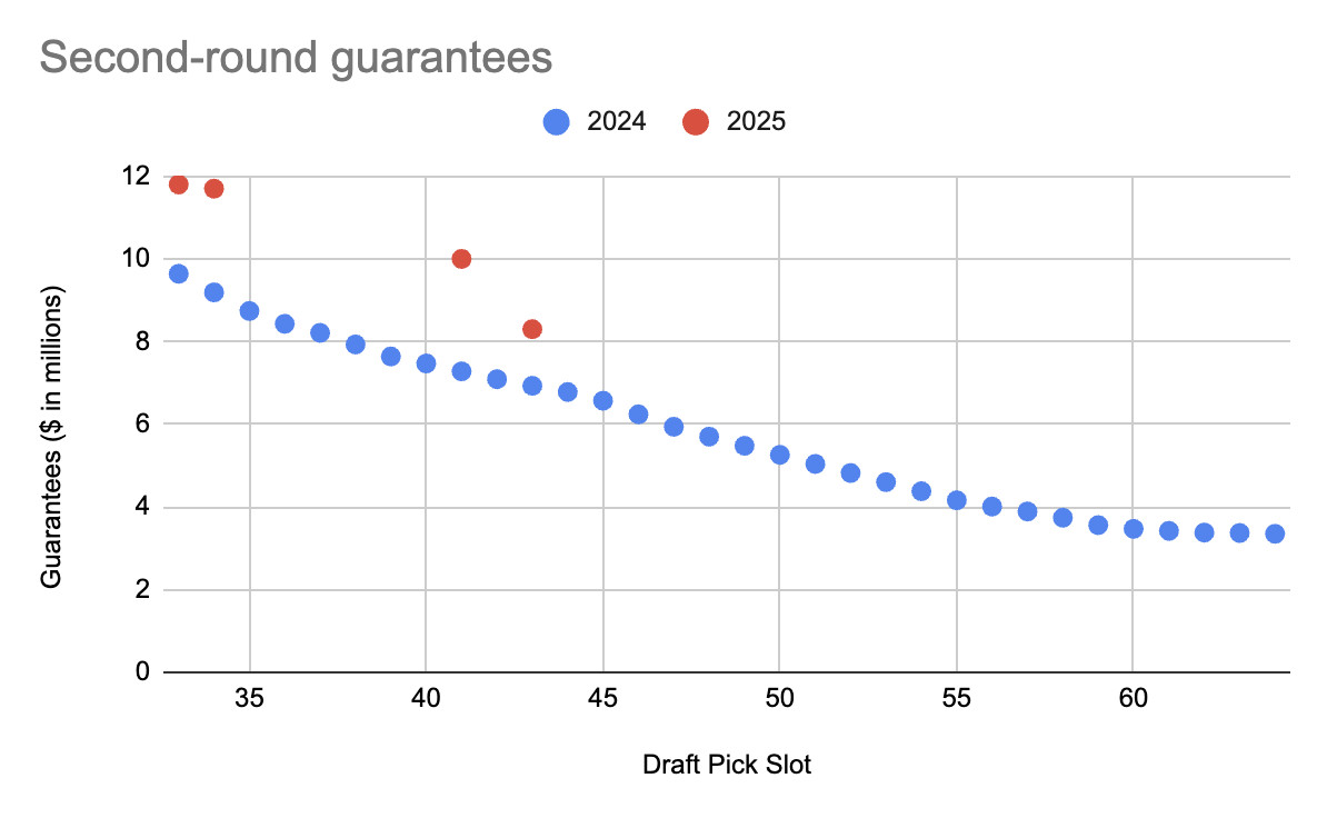 Here’s a look at second-round guarantees, comparing the 2024 and 2025 draft classes, so far. As you can see, Sanders receiving $10 million would be a big win, even relative to Collins.