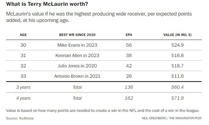 McLaurin deserves respect and reward for what he’s already done, and there’s no question the Commanders would be in trouble this coming season if he didn’t play, given he is far and away the team’s most productive pass-catcher. But NFL contracts aren’t about the past; they’re about paying for future production, and the data strongly suggests his next few seasons will look more like a gentle descent than a sustained peak. Overcommitting to McLaurin at, say, $30 to 35 million per year risks hamstringing the team’s ability to build its roster in the coming years.