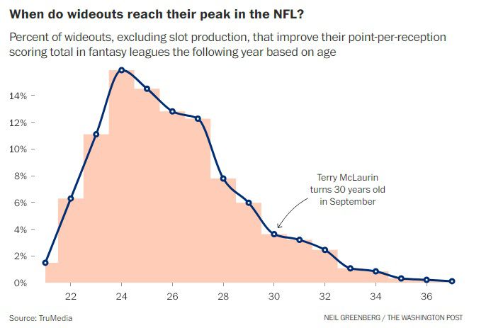 Especially for wide receivers who play primarily on the outside like McLaurin, reaching age 30 is rarely the beginning of anything. Historical aging curves show that production — measured in this case by fantasy football point output — tends to peak between ages 23 and 27, with sharp declines beginning around 28. Fantasy scoring isn’t perfect, but it’s a decent shorthand for real-world productivity. Based on that curve it’s more probable that McLaurin will regress from last year’s highs than sustain or surpass them in the coming seasons.