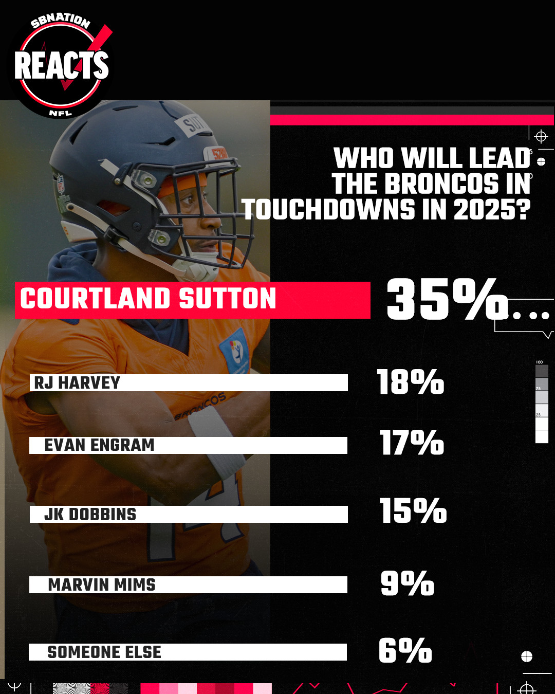 For this week’s SB Nation Reacts by FanDuel survey, I asked who you thought would score the most touchdowns for the Denver Broncos this season. Fans mostly went with wide receiver Courtland Sutton by almost a 2-to-1 margin over the next three contenders.