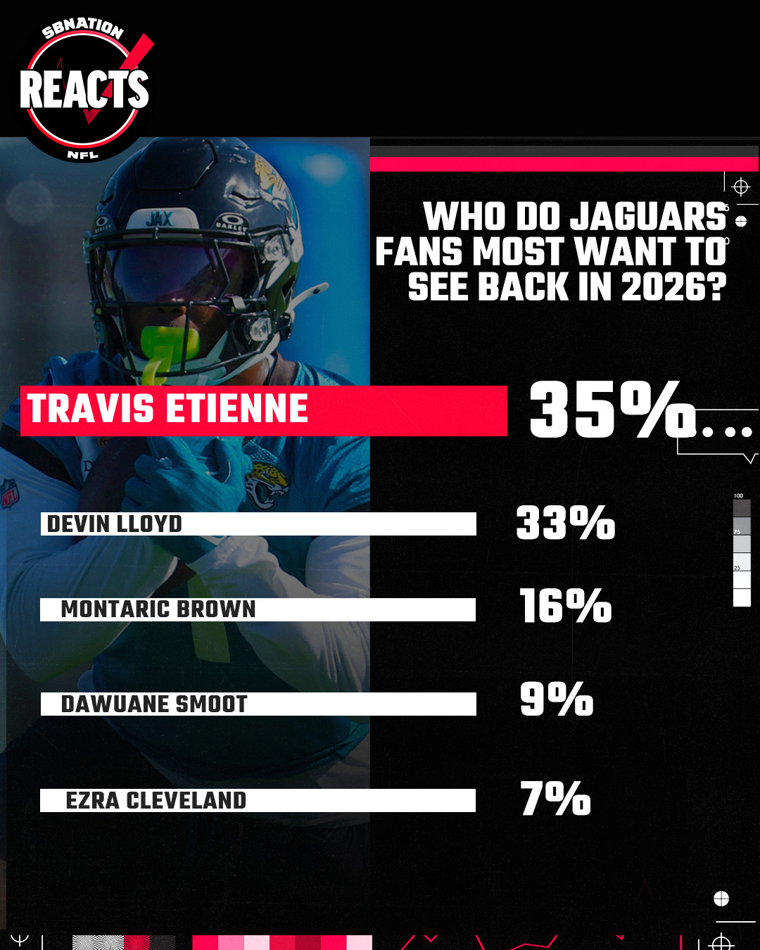 35% of respondents chose running back Travis Etienne, though linebacker Devin Lloyd was close behind with 33% of the votes.