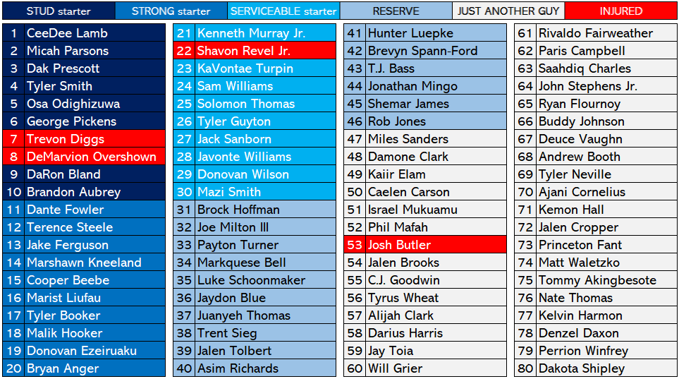 It’s still CeeDee Lamb, Micah Parsons, and Dak Prescott holding down the top spots, and the order hasn’t changed (check out last year’s rankings if you are interested). These three are the team’s “money guys,” and have the contracts to prove it (well, as soon as the Parsons deal gets done). Unfortunately, all of them got hurt last year and missed action. Hopefully, better health and better performance can right the ship this season, and it all starts with these three.