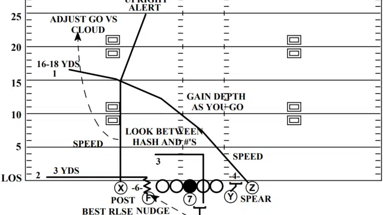 Johnson’s Yankee concept stretches the defense vertically by combining a deep over route with a post, essentially stacking pressure on both the safeties and linebackers. The play-action fake compounds the issue by freezing defenders just long enough to make them late in coverage. If the safety bites shallow, the post route becomes a kill shot. If the safety stays deep, the over route finds daylight behind flat-footed linebackers.