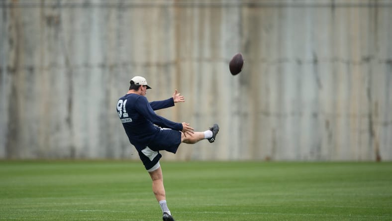 Auburn punter Oscar Chapman runs drills during Auburn Tigers football pro day at the Woltosz Football Performance Center in Auburn, Ala., on Monday, March 24, 2025.