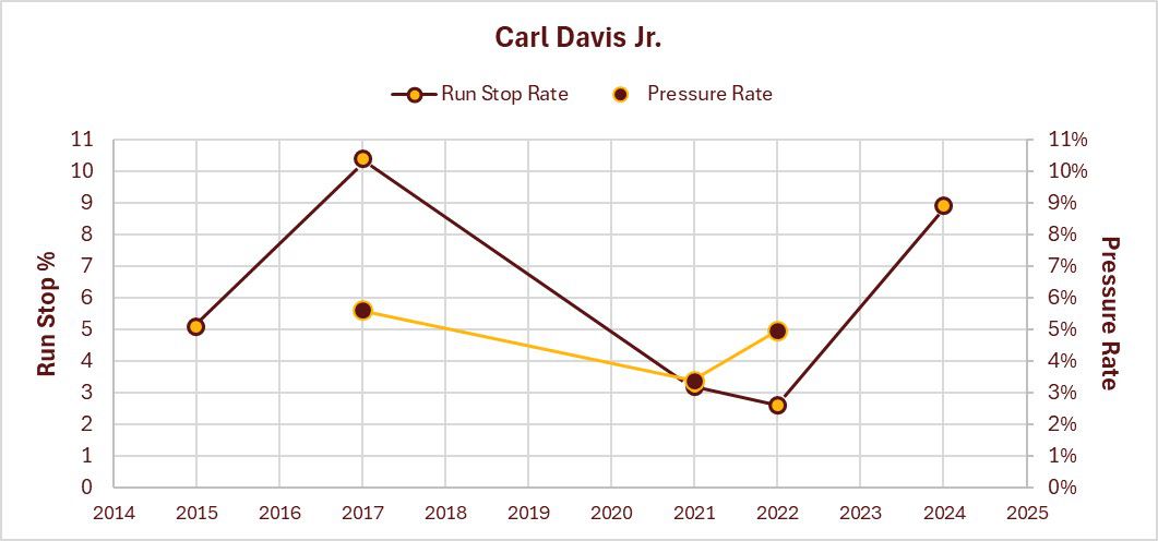 Davis peaked as a run defender when he was healthy in 2017, posting a very respectable 10.4% Run Stop Rate. He has not played enough snaps in most seasons since then to post reportable stats. He only played 48 run defense snaps in 2024, which is just below criterion. But it was close enough that I went ahead and include the data in the graph. His 8.9% Run Stop Rate would have been good for a starter, falling in the top 25% of the position group. That should be taken with a grain of salt, because of the limited snap counts. But, if he can replicate that performance through more playing time, he could be an asset in run defense.
