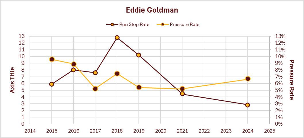 Goldman peaked as an elite run stopper in 2018, with a 12.8% Run Stop Rate (5th in NFL). Then he took the 2020 COVID season off and retired from football from 2022 to 2023. He came out of retirement in 2024 and posted a career low Run Stop Rate of 2.8%, which ranked near the bottom of the league. He was better in the pass rush, but his Pressure Rate was still below median for starters.