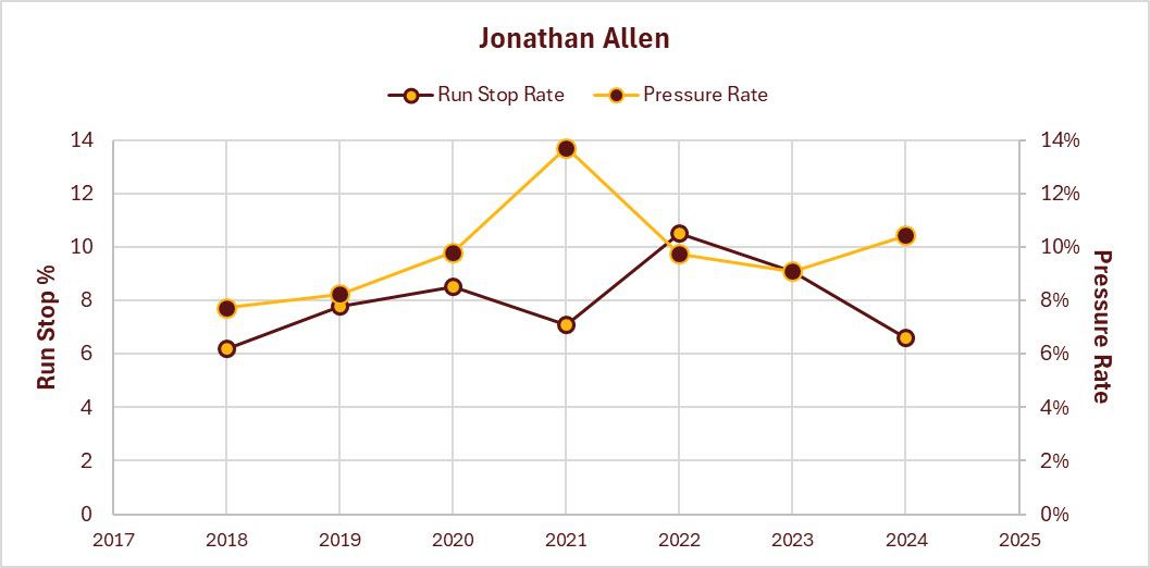 Javon Kinlaw was signed in free agency to replace Jonathan. Allen’s Run Stop Rate was slightly better than Kinlaw’s last season, despite the fact that it was Allen’s lowest figure since 2018. Kinlaw was a little better run stopper than Newton. Kinlaw’s Pressure Rate in the pass rush was lower than Allen’s and Newton’s last season. Kinlaw has only surpassed Allen in the pass rush once, during his peak season in 2023, which was Allen’s worst season since 2019.