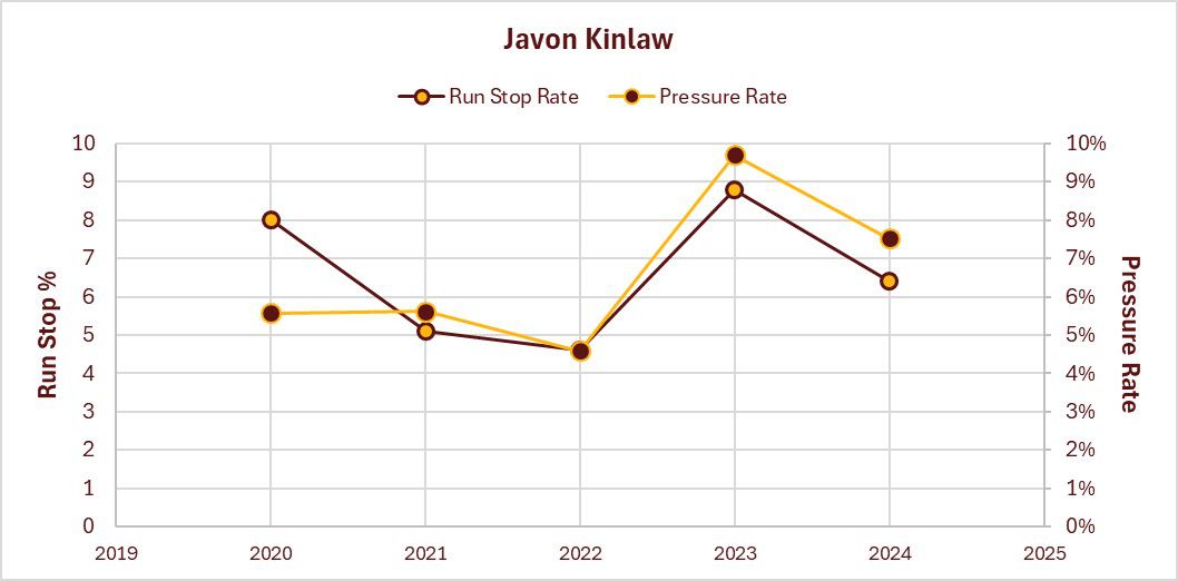 2024 Run Stop Rate: 3.8%, Rank: 221/287 Power Five | Pressure Rate: 12.8%