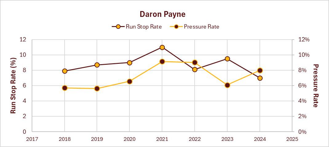The fall off in run defense in 2024 is a little concerning, but Payne is still fairly young. Whether or not he can bounce back to something closer to his early career form is one of the biggest questions on the Commanders’ defense.