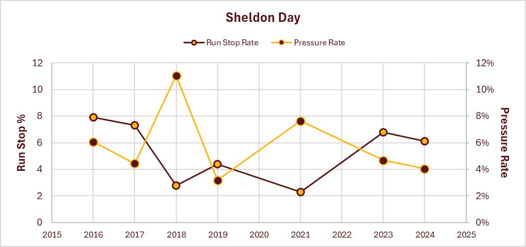 Day’s 2024 Run Stop Rate, ranked 81st among qualifying iDL, and was below median for NFL starters. He was essentially a non-factor in the pass rush. The pattern was essentially opposite to what you’d expect from an undersized iDL.