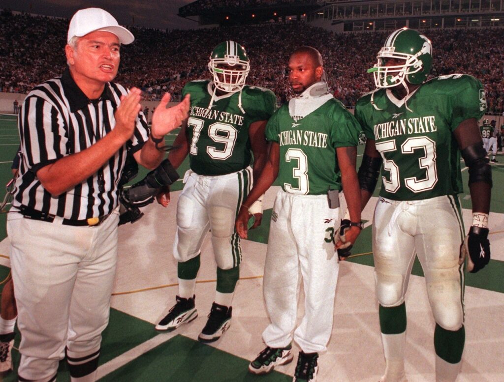 Sept 12, 1998; Lansing, MI, USA; FILE PHOTO; MSU’s Amp Campbell stands hand in hand with his teammates Jason Strayhorn and Courtney Ledyard during the coin toss before the Spartans’ 1998 game against Notre Dame. Mandatory Credit: Lansing State Journal-USA TODAY NETWORK