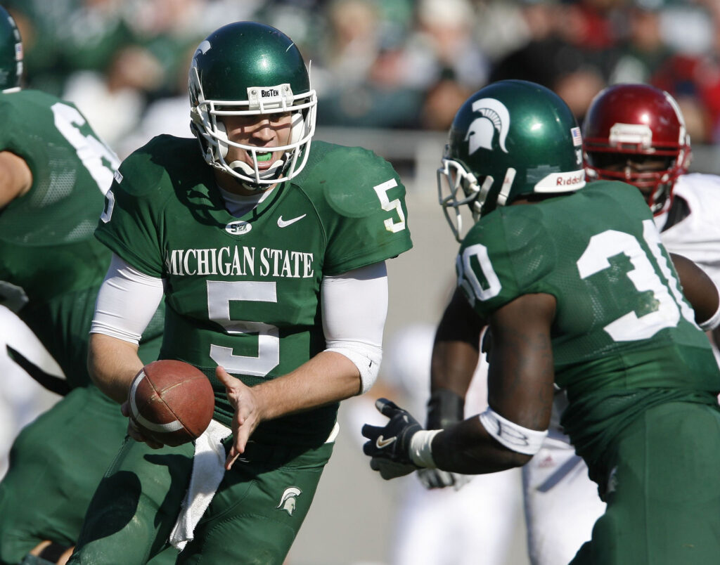 Oct 29, 2005; East Lansing, MI, USA; Michigan State Spartans quarterback #5 Drew Stanton hands off the ball to #30 Jehuu Caulcrick in the third quarter against Indiana Hoosiers at Spartan Stadium. Spartans beat the Hoosiers 46-15. Mandatory Credit: Photo By Matthew Emmons- USA TODAY Sports