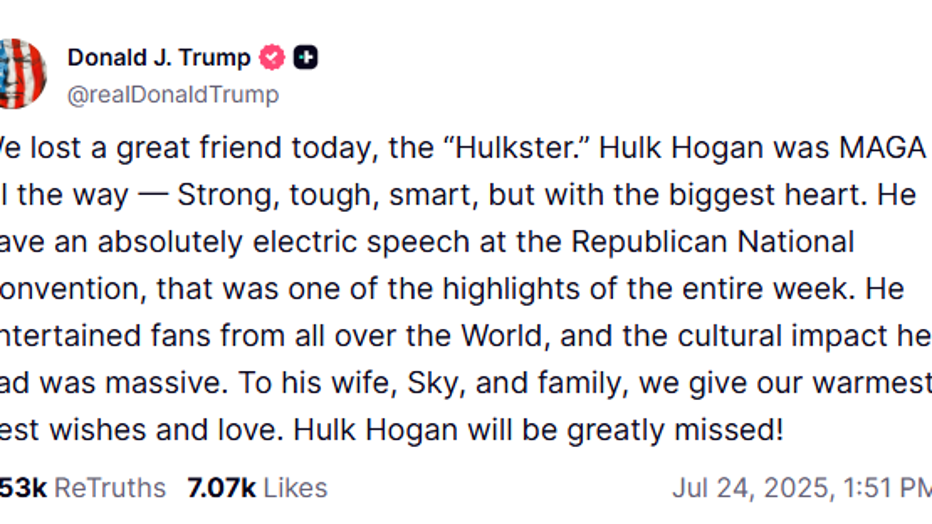 President Donald Trump took to social media to remember Hogan, saying: “We lost a great friend today, the “Hulkster.” Hulk Hogan was MAGA all the way — Strong, touch, smart, but with the biggest heart. He gave an absolutely electric speech at the Republican National Convention, that ws one of the highlights of the entire week. He entertained fans from all over the World, and the cultural impact he had was massive. To his wife, Sky, and family, we give our warmest best wishes and love. Hulk Hogan will be greatly missed.”