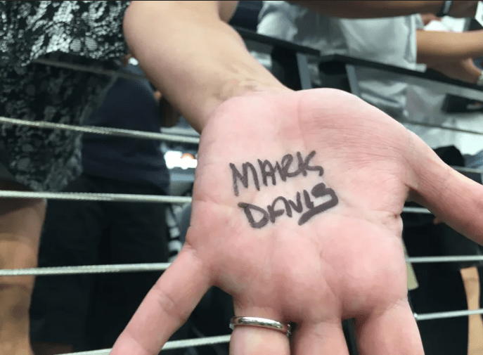 Fan has her hand signed by Mark Davis before a Raiders preseason game in 2022.