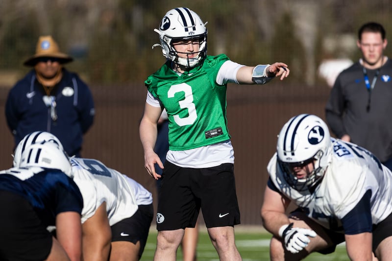 McCae Hillstead will be BYU’s Week 1 starting quarterback … and keep that role for the entirety of the seasonBYU quarterback McCae Hillstead (3) calls out before a play during the opening day of BYU football spring camp held at the Zions Bank Practice Fields of the Student Athlete Building on the campus of Brigham Young University in Provo on Thursday, Feb. 27, 2025. | Isaac Hale, Deseret News