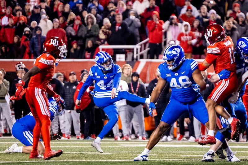 Will Ferrin will earn first team All-American honors at kickerBYU place kicker Will Ferrin (44) kicks and makes a field goal to put the Cougars ahead 22-21 with seconds left on the clock during a game between the University of Utah Utes and the Brigham Young University Cougars held at Rice-Eccles Stadium in Salt Lake City early on Sunday, Nov. 10, 2024. | Isaac Hale, Deseret News