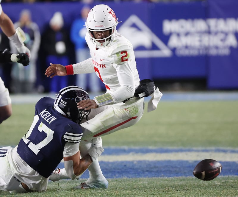 BYU’s defense will record 26+ total sacksBYU linebacker Jack Kelly causes a fumble by Houston Cougars quarterback Zeon Chriss in Provo on Saturday, Nov. 30, 2024. | Jeffrey D. Allred, Deseret News