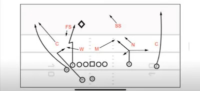 “So what we’re creating on the backside here is, okay, they squeeze that lookie route. Well, now we’re creating a high-low on that will linebacker and the stick route, the stick nod route wins on that free safety. You see that free safety in the diagram. I show him biting down on the stick route there. So, he’s going to win over the top. And I believe this was a red zone touchdown; I can’t remember what week it was for San Francisco last year, but this is a neat variation of a base concept that they’ve had success with over the years.