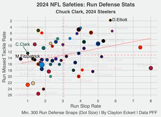 There is a bright side to Clark when looking at his career numbers. He has a better 8.8-percent missed-tackle rate over seven seasons. This ironically matches Fitzpatrick’s 2024 number, so Clark has a resume of above-average results in avoiding missed tackles.