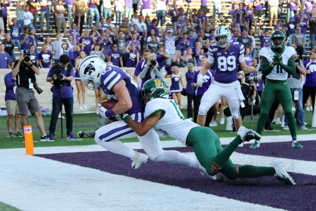 Oct 5, 2019; Manhattan, KS, USA; Kansas State Wildcats wide receiver Dalton Schoen (83) makes a touchdown catch against Baylor Bears cornerback Raleigh Texada (13) during the fourth quarter of a game at Bill Snyder Family Stadium. Mandatory Credit: Scott Sewell-USA TODAY Sports