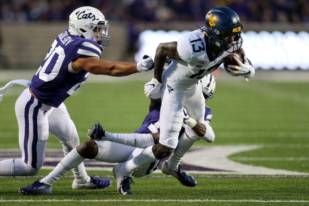 Nov 16, 2019; Manhattan, KS, USA; West Virginia Mountaineers wide receiver Sam James (13) breaks away from Kansas State Wildcats defensive backs Walter Neil Jr. (15) and Denzel Goolsby (20) during the fourth quarter of a game at Bill Snyder Family Stadium. Mandatory Credit: Scott Sewell-USA TODAY Sports