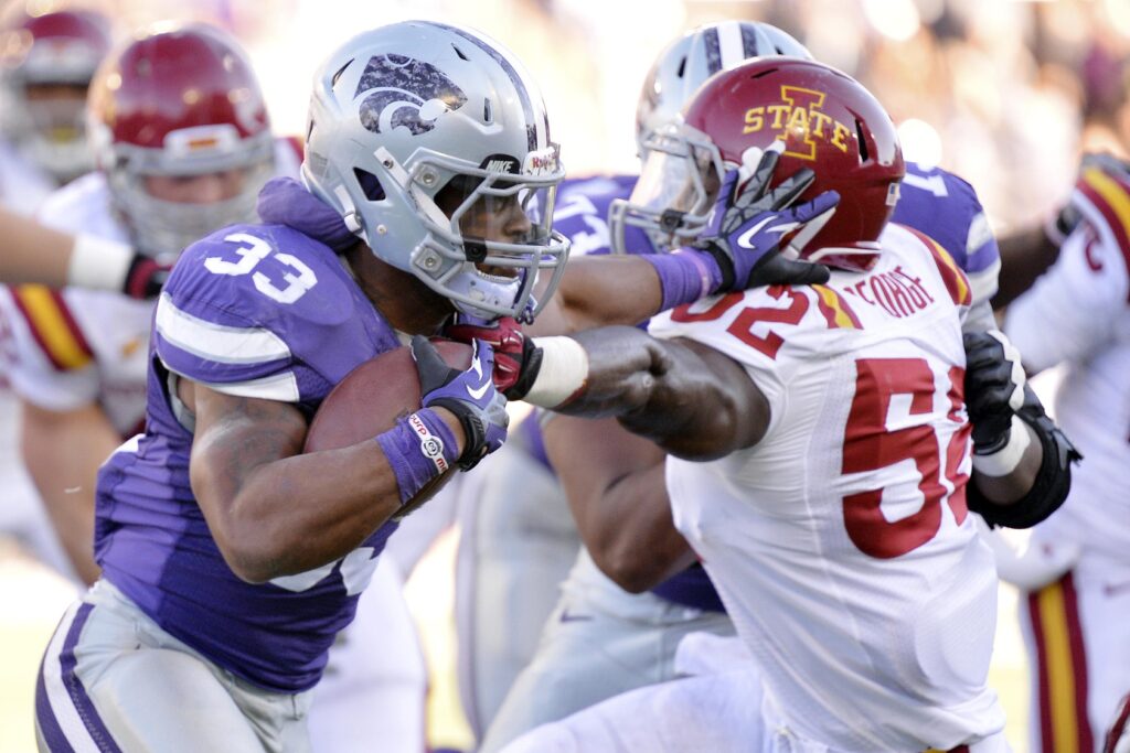 Nov 2, 2013; Manhattan, KS, USA; Kansas State Wildcats running back John Hubert (33) stiff arms Iowa State Cyclones linebacker Jeremiah George (52) during the second half at Bill Snyder Family Stadium. The Wildcats defeat the Cyclones 41-7. Mandatory Credit: Jasen Vinlove-USA TODAY Sports
