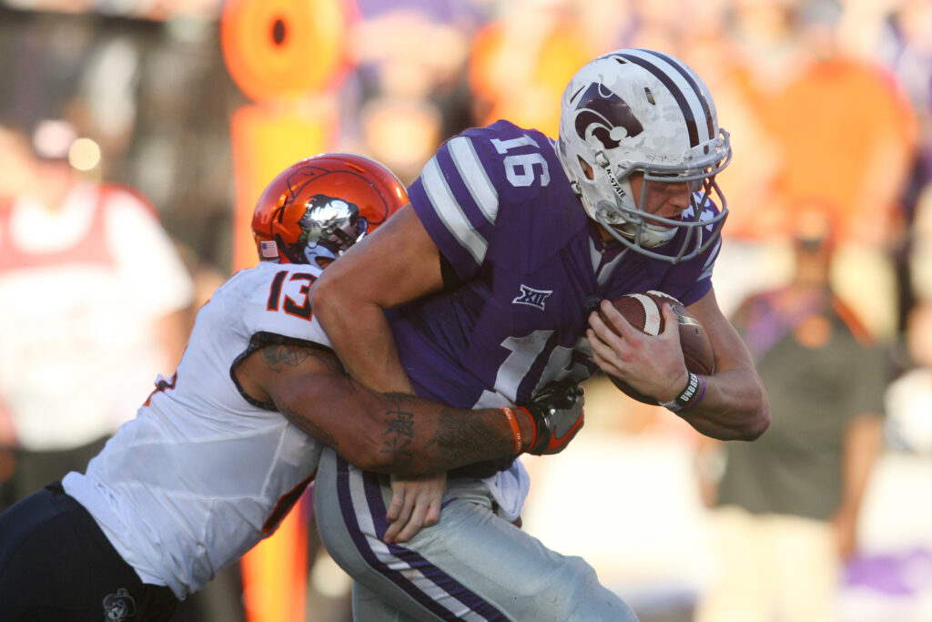 Nov 5, 2016; Manhattan, KS, USA; Oklahoma State Cowboys safety Jordan Sterns (13) tackles Kansas State Wildcats quarterback Jesse Ertz (16) at Bill Snyder Family Football Stadium. The Cowboys won 43-37. Mandatory Credit: Scott Sewell-USA TODAY Sports