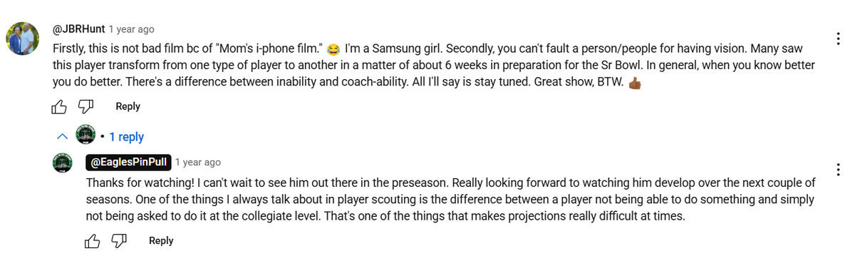 That “if” is suddenly looking a lot more realistic. I still believe there’s more to unlock with his coverage ability, and I’d love to see a broader role for him in year 2. I’m not sure he will just be a straight up EDGE rusher who drops into coverage at the same rate as everyone else, but I could easily be wrong again! I hope the Eagles use his full skillset this year.