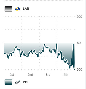 ESPN’s analytics take into account that—even if the Rams scored a touchdown on their final offensive possession—the Eagles would only need a field goal to steal away victory. Sure, the Rams defense had the Eagle’s number for most of the second half; however, you’d take those odds in the postseason when the margins are ever-slim.