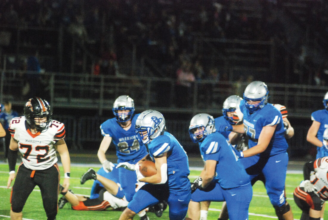 Warren’s Eric Carr carries the ball as Marietta’s Zach Carver chases him during last year’s game in Vincent. Warren went on to win 35-16 to clinch the Twin State League championship. (Photo by Jordan Holland)