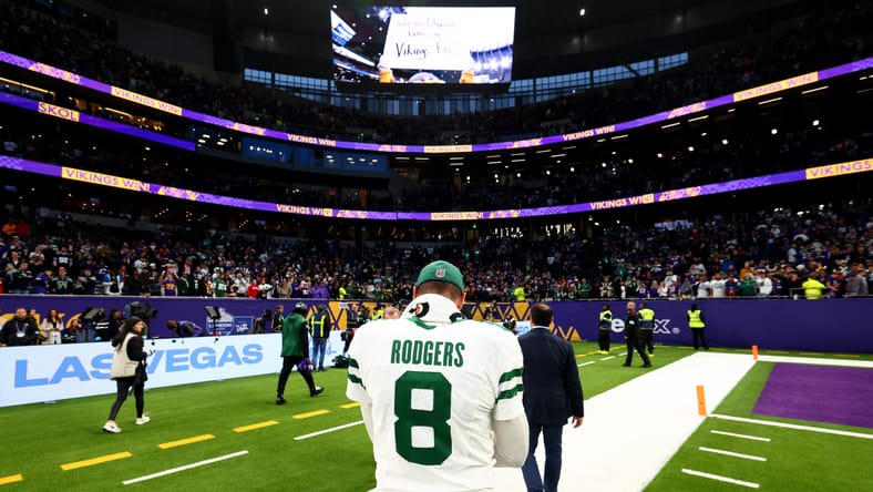 Oct 6, 2024; Tottenham, ENG; New York Jets Quarterback Aaron Rodgers (8) walks to the locker room after the 17-23 defeat against the Minnesota Vikings at Tottenham Hotspur Stadium. Mandatory Credit: Shaun Brooks-Imagn Images