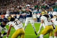 Quarterback Drew Allar (15) receives the snap during the College Football Playoff semifinal game between Penn State and Notre Dame at the Orange Bowl on Thursday, Jan. 9, 2024 in Hard Rock Stadium in Miami, Fla. The Fighting Irish beat the Nittany Lions 27-24.