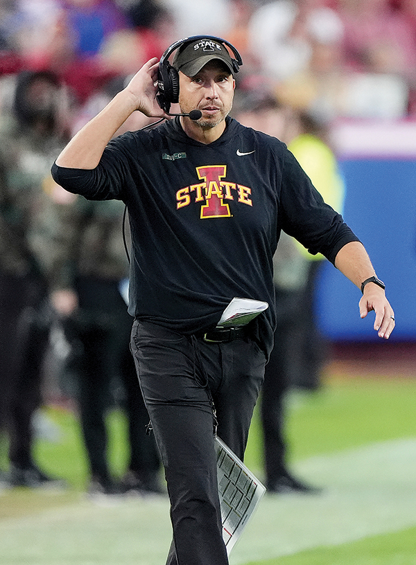 AP FILE PHOTO – Iowa State head coach Matt Campbell looks on during the second half of a college football game against Kansas on Nov. 9, 2024, in Kansas City, Mo. Kansas won 45-36.