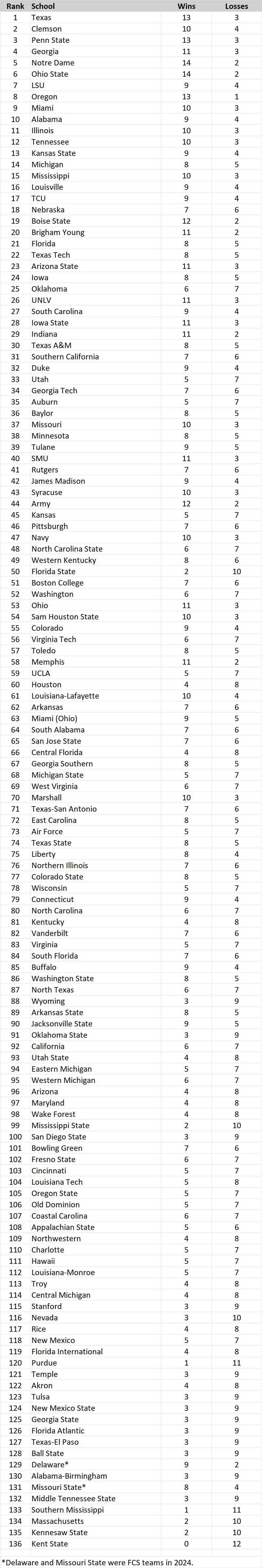But Kent State now sits at No. 136 with the addition of two newcomers to the FBS. Delaware and Missouri State will join Conference USA this season but not be eligible for the conference championship or the postseason while transitioning from the Championship Subdivision.