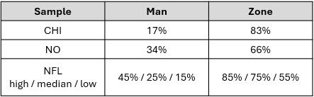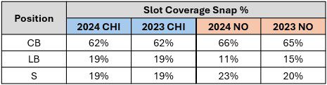 This data is from 2024, but the numbers for Chicago and New Orleans’ defenses were essentially the same in 2023. Allen runs man coverage about twice as often as Eberflus did, but the majority of the time is still zone. Now, Chicago should expect to be in man about 1⁄3 of the time, whereas it was about 1/6 under Eberflus.