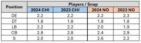 Let’s start with a basic look at how many players from each position are on the field each snap. The table below shows that data for both the New Orleans Saints and the Bears across the 2023 and 2024 seasons (data from Pro Football Reference).