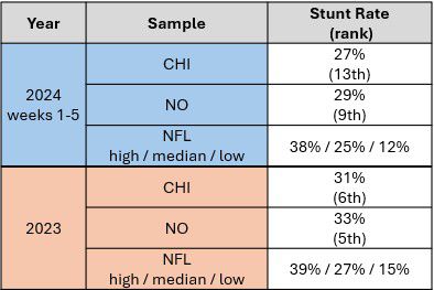 One other thing to note is how frequently the defensive line stunts, or has 2 defensive linemen exchange rush lanes. Data on this is less publicly available, but I was able to find it from PFF for all of 2023 and the first 5 weeks of 2024. That data is shown in the table below.