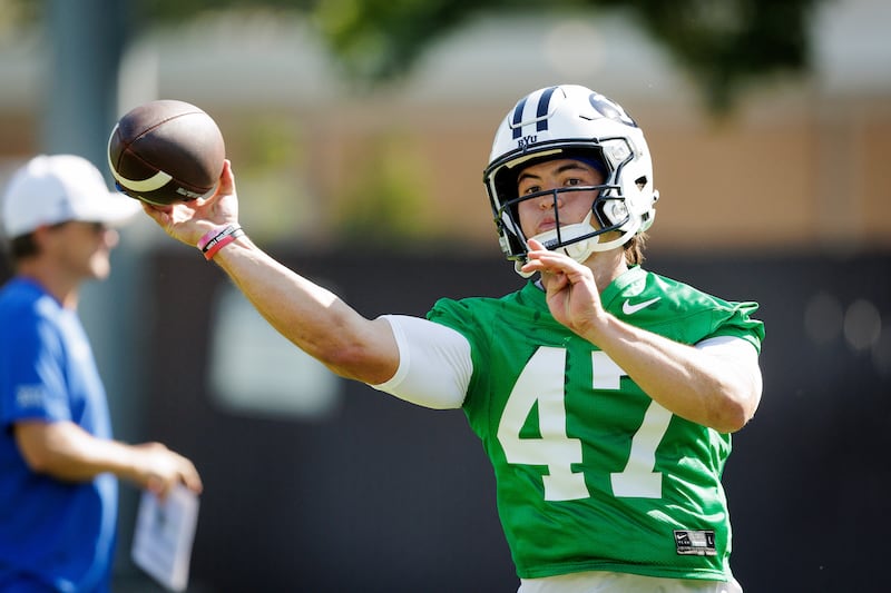 BYU QB Bear Bachmeier throws a pass during the opening day of fall camp Wednesday, July 30, 2025. | Jaren Wilkey/BYU PHOTO