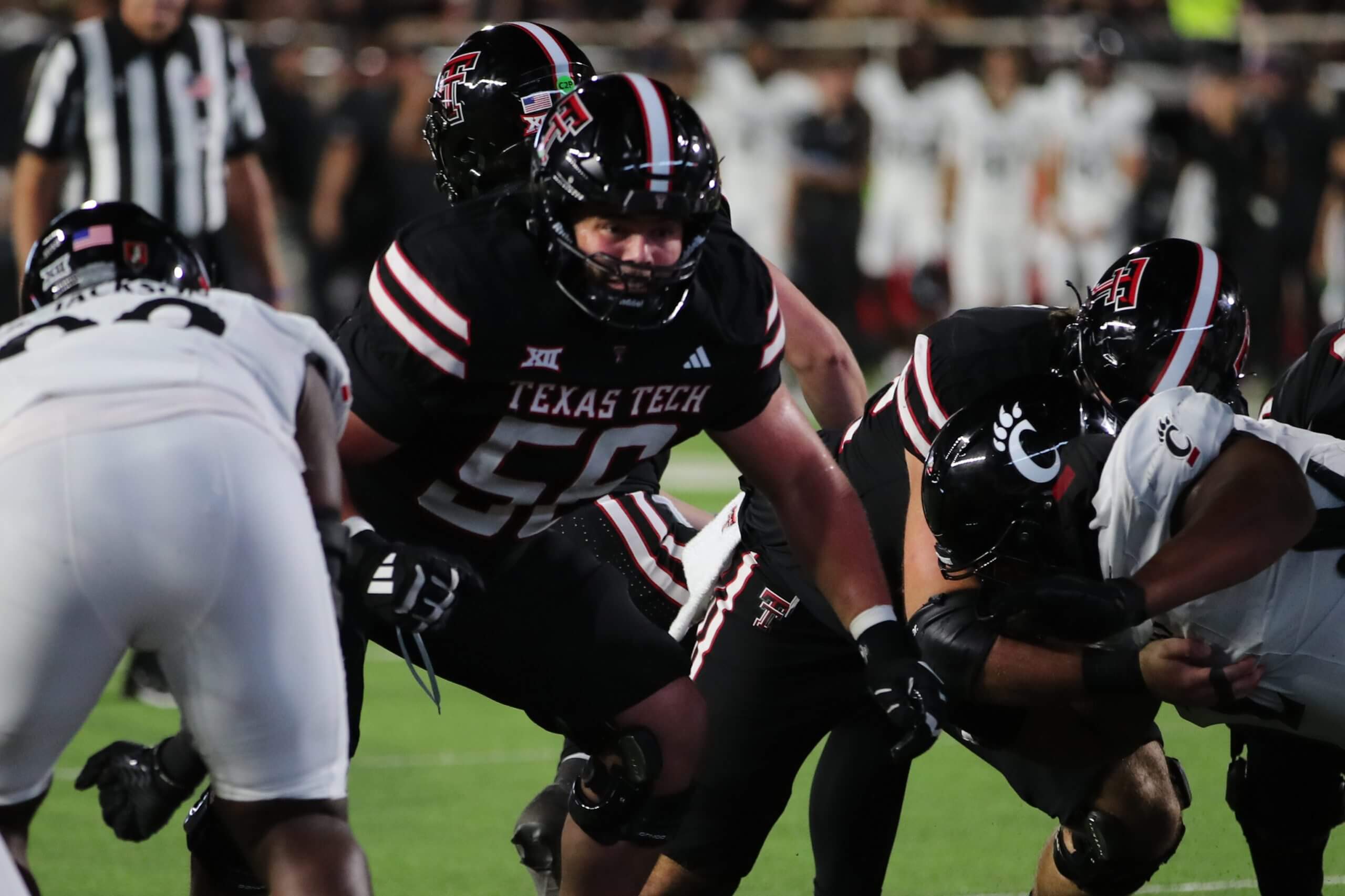 Davion Carter (56) has been a force on the field since his arrival in Lubbock. (Michael C. Johnson / Imagn Images)No. 89 Braylin Presley, Tulsa, WR-KR