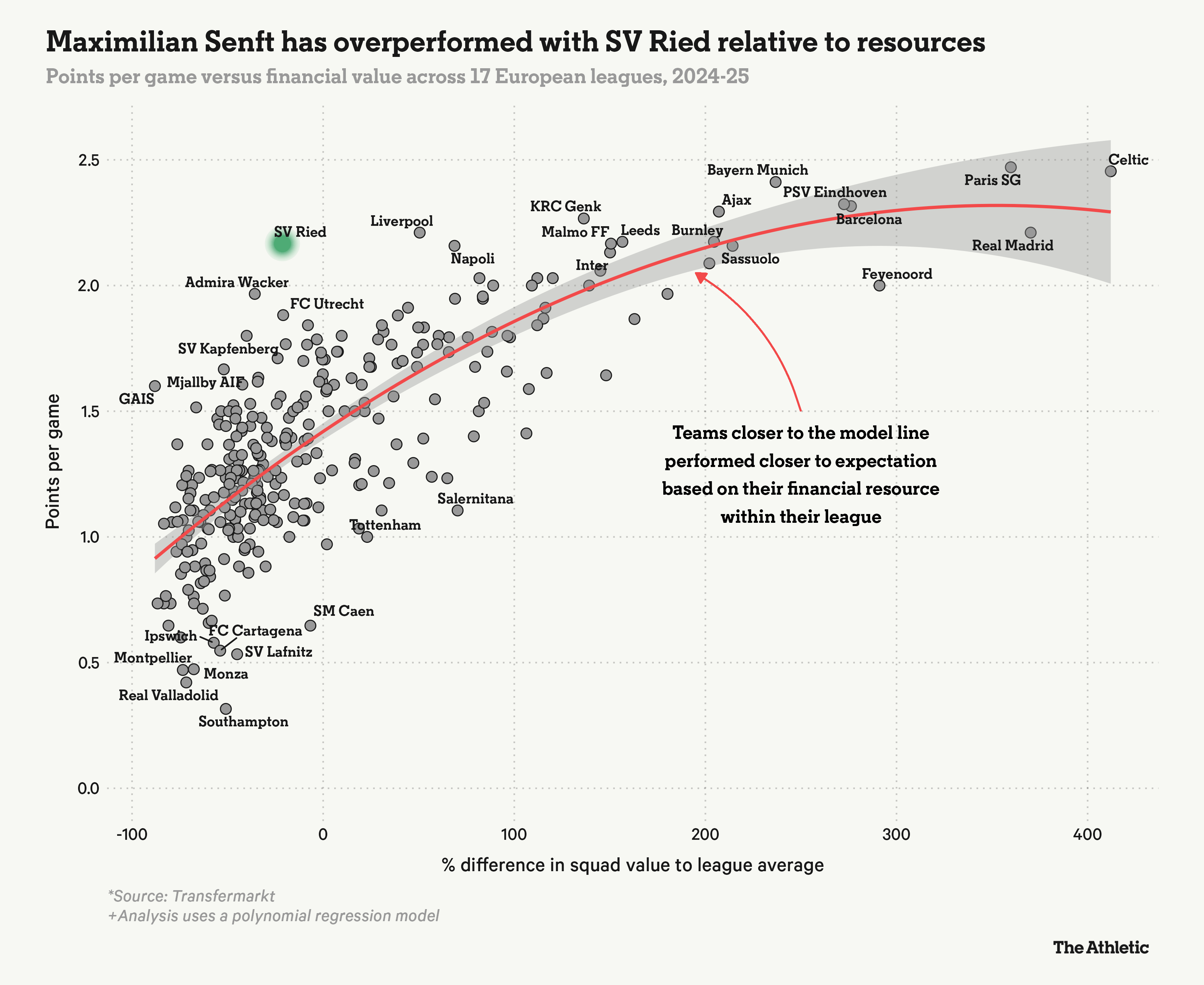 One easy analysis can map a team’s points per game compared with their squad’s value, relative to the league average. When doing so across Europe’s wider leagues, Senft’s side pop out as a notable statistical outlier.