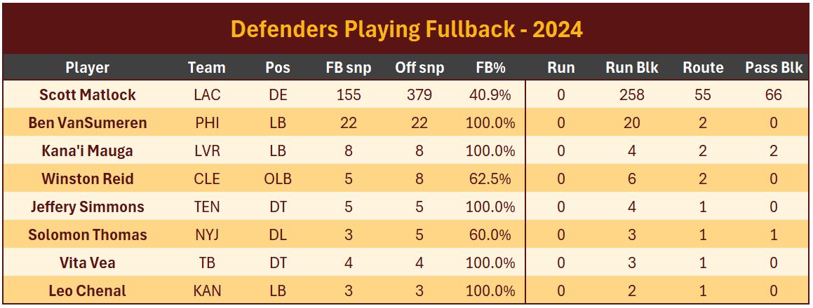 Now we know what to look for, let’s see what players at other positions filled the fullback role for NFL offenses in 2024.