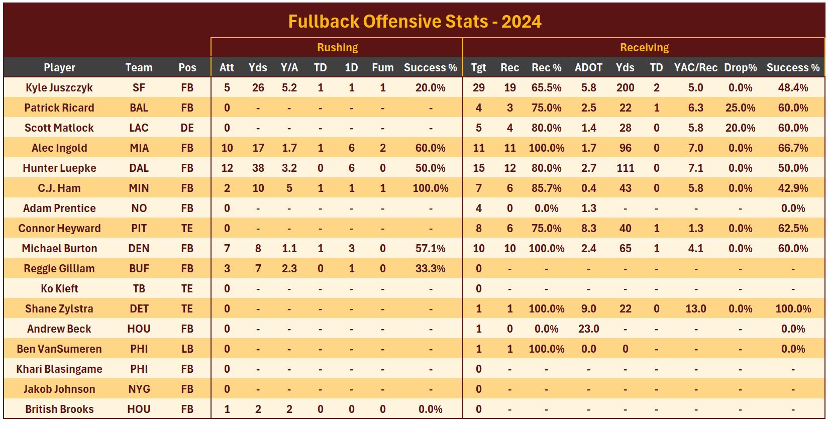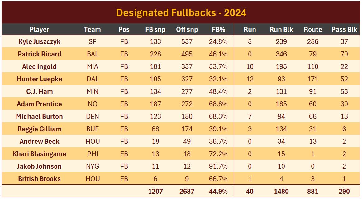 The designated fullback who got the most playing time is the San Francisco 49ers’ Kyle Juszczyk. Juszczyk made the Pro Bowl for the ninth consecutive season in 2024 and received his second consecutive All Pro nomination. Perhaps ironically, Juszczyk took the lowest percentage of offensive snaps lined up as a fullback (FB%) of any of the designated fullbacks.