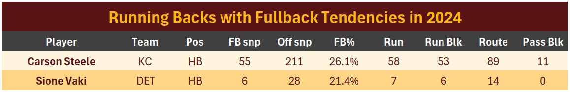In an effort to find some holdovers from the previous era, I searched 2024 rosters for RBs who took a high proportion of snaps at FB. Surprisingly, I only turned up two players, who are fairly different from the fullbacks we’ve seen thus far. The separation of the RB and FB roles in today’s NFL has become even more pronounced than I had suspected.