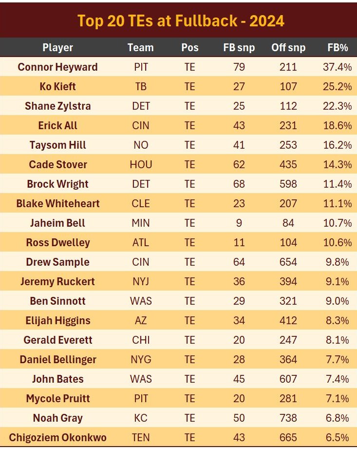 Above 10% offensive snaps at fullback, you’ve got a fullback-like TE. There were 8 such players in 2024. I’d also suggest keeping an eye on Detroit’s Shane Zylstra and the Bengals’ Erick All to see if they come out as fullbacks this season.